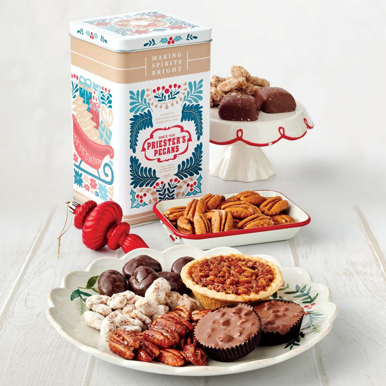 True to its name, this festive tin delivers comfort, joy, and a whole lot of pecans. Inside you’ll find three full pounds of Priester’s most popular Southern snacks: Natural Pecan Halves, Praline Pecans, Honey Glazed Pecans, and Milk Chocolate Pecans. It’s a generous and beautiful gift they’ll love refilling all year long.