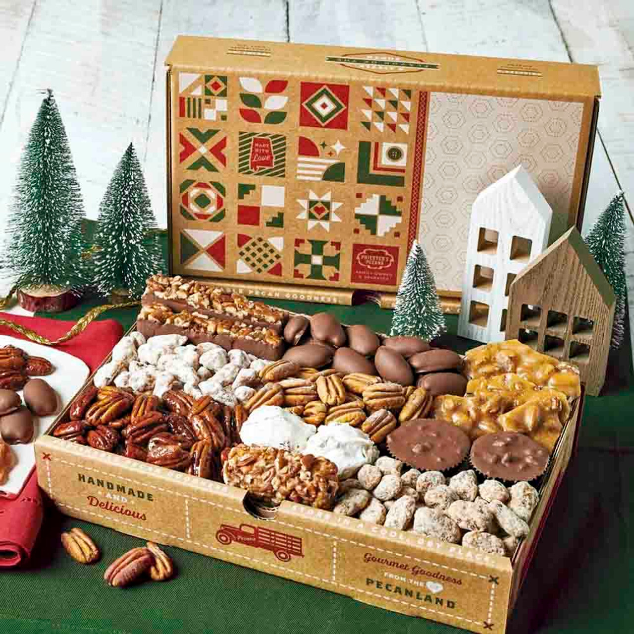 Make the holidays unforgettable with this festive gift box packed to the brim with Southern charm. Inside, you’ll find 3 lbs. 4 oz. of handcrafted pecan treats and holiday favorites—like crisp Pecan Brittle, creamy Divinity, Milk Chocolate Fiddlesticks, Roasted & Salted Pecans, Honey Glazed Pecans, Toasted Pecan Clusters, and a pair of Mini Pecan Pies (classic and chocolate!). It’s beautifully packaged and ready to gift to family, friends, clients, or anyone you want to wow this season.