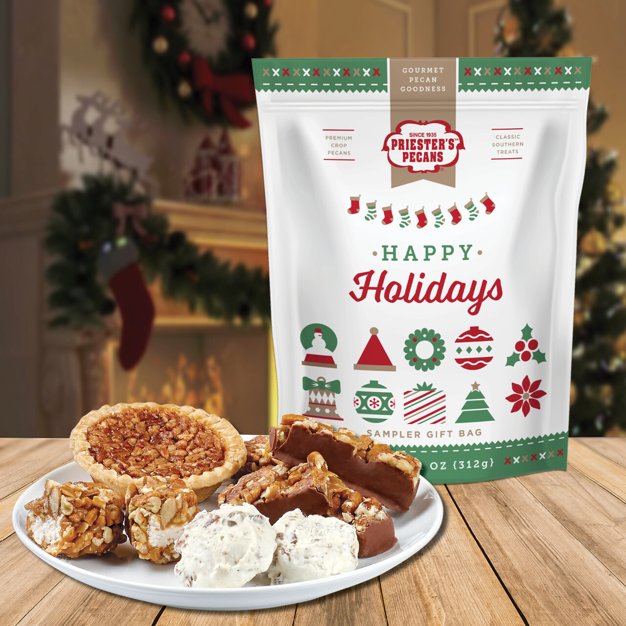 Small in size but full of Southern sweetness, this festive gift bag is ready to tuck into a stocking or hand out with a smile. Inside, you’ll find a Mini Old-Fashioned Pecan Pie, a creamy piece of Old-Fashioned Divinity, a Milk Chocolate Pecan Fiddlestick, and a classic Pecan Log—each handcrafted with love in our Alabama kitchen. It’s a quick and easy way to say “Happy Holidays” with something sweet.